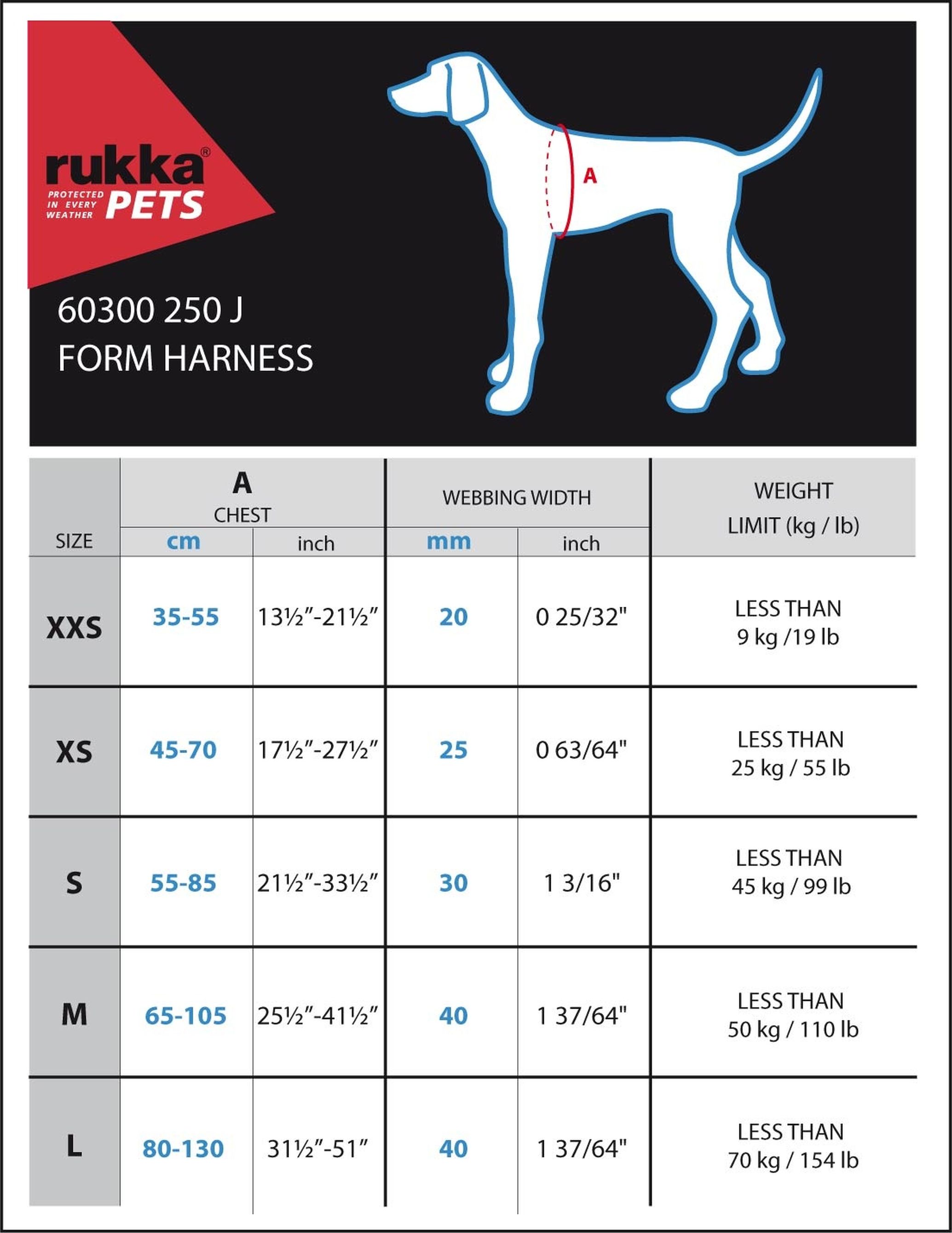 - Brustumfang: 35-55 cm, 45-70 cm, 55-85 cm, 65-105 cm, 80-130 cm